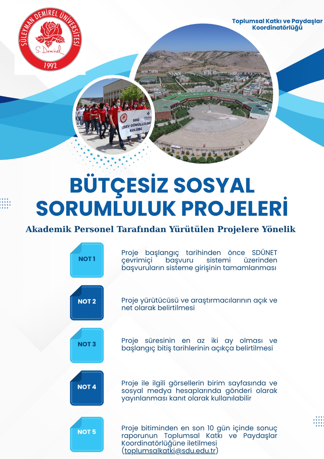 Toplumsal katkı ve sosyal sorumluluk kapsamında bütçe gerektirmeyen projeler için Toplumsal katkı ve Paydaşlar Koordinatörlüğü’ne doğrudan SDÜNET platformundaki uygulamalarda yer alan” Çevrimiçi Başvuru Sistemi” kısmından ya da https://basvuru.sdu.edu.tr/ adresi üzerinden ulaşabilirsiniz.